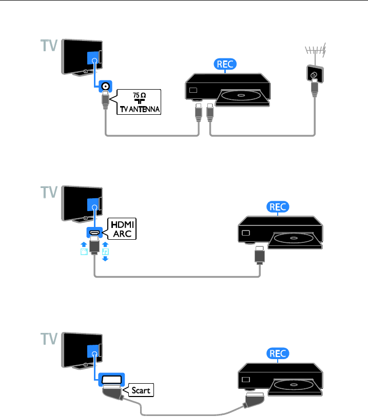 Conecte el grabador con un cable de antena al televisor.